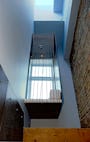 A creative use of existing materials influenced the aesthetic, as well as achieved the environmental goals of the project. One recurring theme is stairways using salvaged roof and floor joists with nails removed and surfaces sanded. The terrazzo floor in the master bathroom contains aggregate of broken mirrors and shattered vinyl LP's, which were ground into bits by the clients with their blender and food processor.
